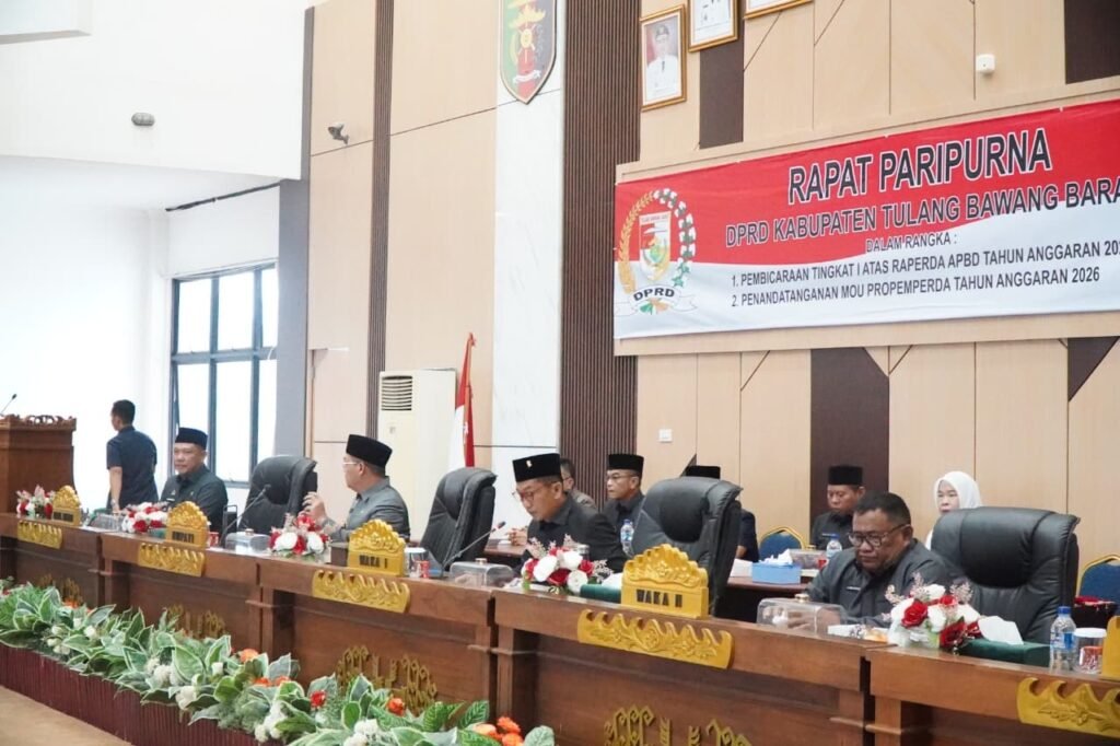 Tulang Bawang Barat,—-DPRD Kabupaten Tulang Bawang Barat menggelar Rapat Paripurna untuk Pembicaraan Tingkat I atas Rancangan Peraturan Daerah (Raperda) tentang Anggaran Pendapatan dan Belanja Daerah (APBD) Tahun Anggaran 2026, rapat dilaksanakan pada Senin,14 Oktober 2025.